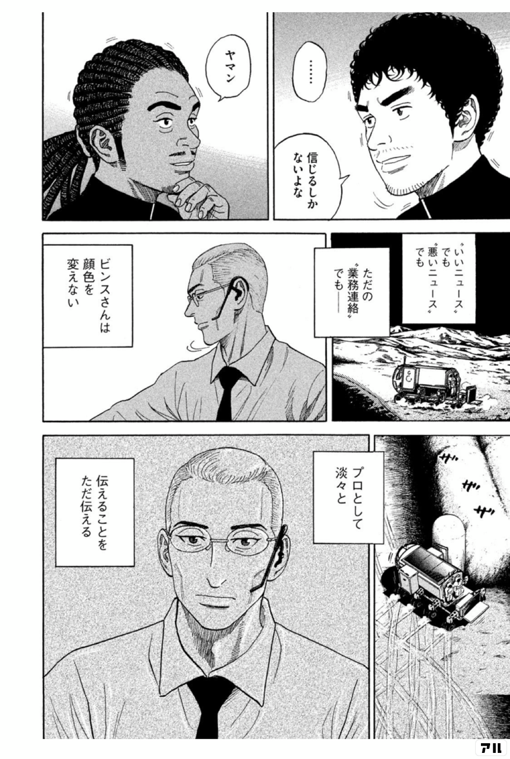 信じるしかないよな ヤマン いいニュース でも 悪いニュース でも ただの 業務連絡 でもー ビンスさんは顔色を変えない プロとして淡々と 伝えることをただ伝える 宇宙兄弟 アル