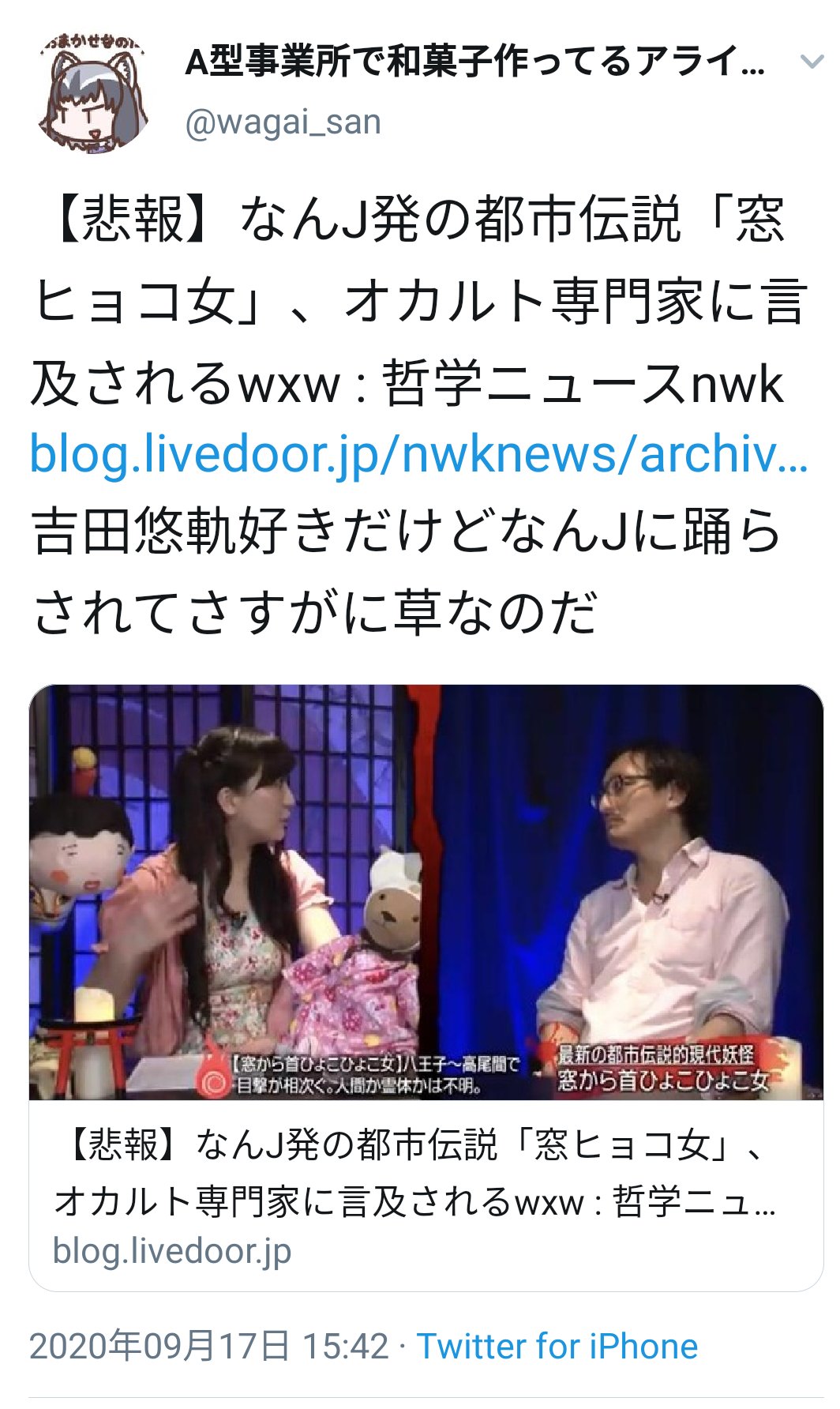 Yoshidakaityou On Twitter 窓から首ヒョコヒョコ女 がなんj発だって事 知ってるどころか4月時点で大元から全ログ総チェックしてるわ なんで 何も知らずネット発のネタをとりあげた馬鹿 扱いされてんだよ むかつく 悲報 なんj発の都市伝説 窓ヒョコ女