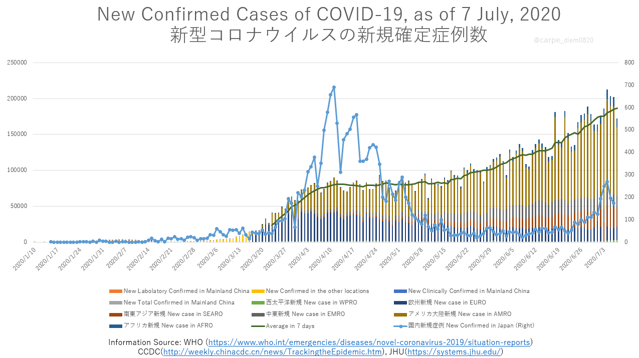 Mugen Ujiie 氏家 無限 Twitterissa 新型コロナウイルス感染症 7 July 2020 累計確定患者11 500 302例 死亡者535 759例 新規患者172 512例 43 686 26 051 22 252 8 971 6 368 4 683 4 207 3 721 3 638 3 201 1週間の平均新規