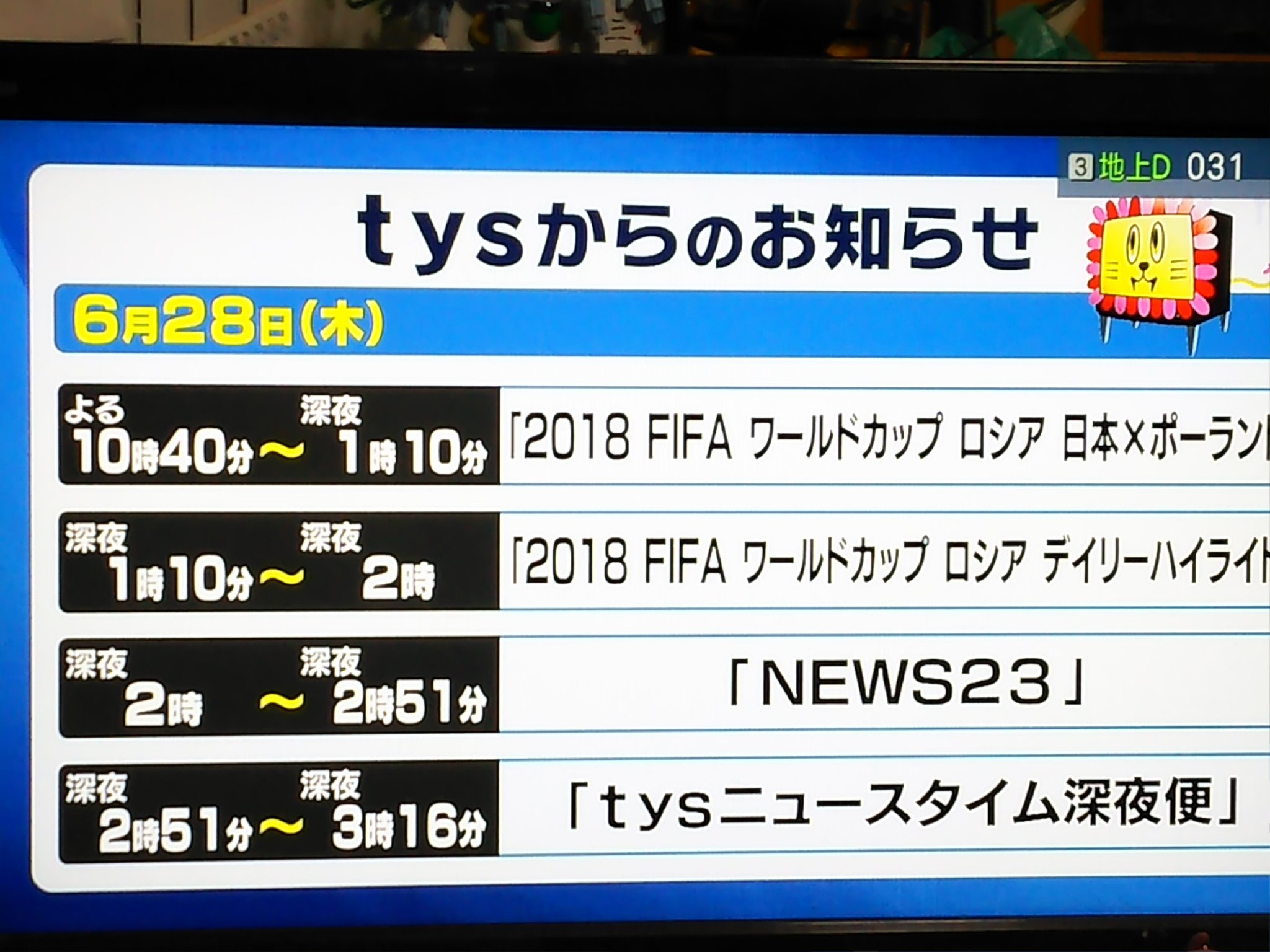 たか三郎 骨折入院中 On Twitter フジテレビ系列がない山口県 明日のw杯の対ポーランド戦はどうするんだと思って番組表を確認 なるほど 番組を飛び降りて中継をねじ込んでくれるクロスネット対応なのね