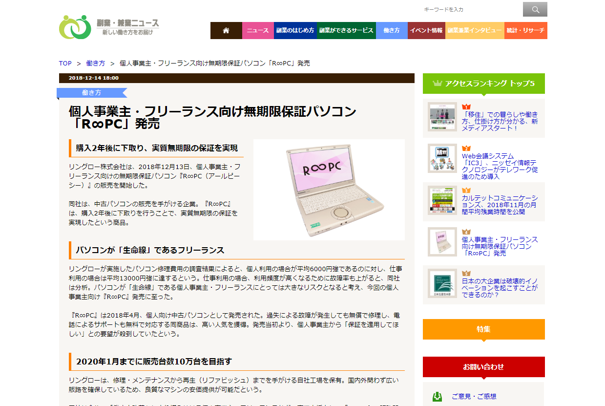 副業 兼業ニュース に掲載されました リングロー株式会社